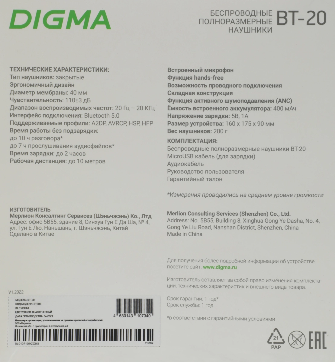 Гарнитура накладные Digma BT-20 ANC черный беспроводные bluetooth оголовье (BT20) (BT20#MLN)