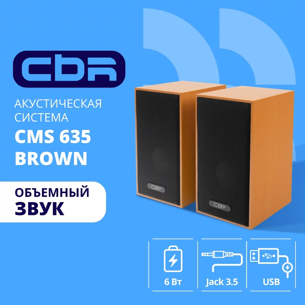CBR CMS 635 Brown, Акустическая система 2.0, питание USB, 2х3 Вт (6 Вт RMS), материал корпуса MDF, 3.5 мм линейный стереовход, регул. громк., длина кабеля 1 м, цвет светло-коричневый