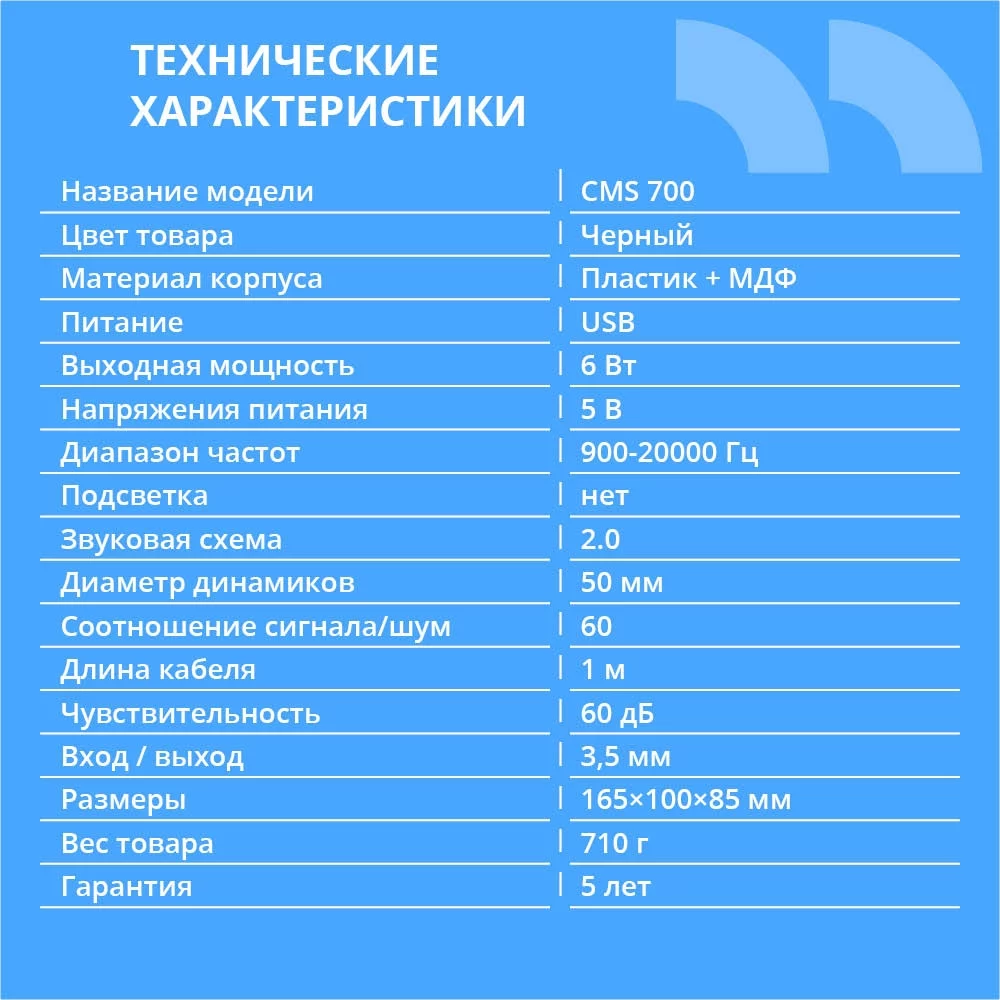 CBR CMS 700, Акустическая система 2.0, питание USB, 2х3 Вт (6 Вт RMS), материал корпуса MDF, 3.5 мм линейный стереовход, цвет чёрный