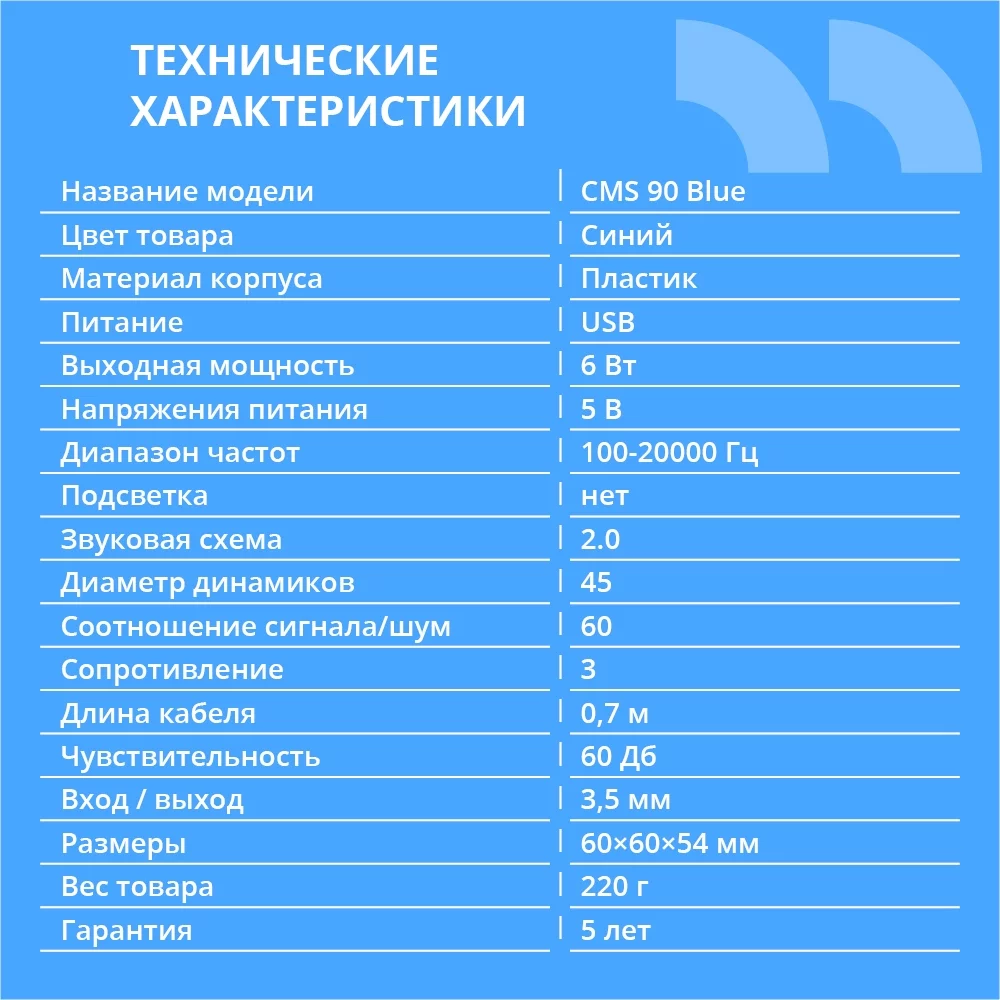 CBR CMS 90 Blue, Акустическая система 2.0, питание USB, 2х3 Вт (6 Вт RMS), материал корпуса пластик, 3.5 мм линейный стереовход, регул. громк., цвет голубой