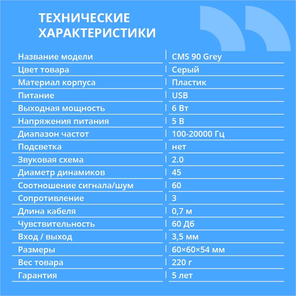 CBR CMS 90 Grey, Акустическая система 2.0, питание USB, 2х3 Вт (6 Вт RMS), материал корпуса пластик, 3.5 мм линейный стереовход, регул. громк., цвет серый