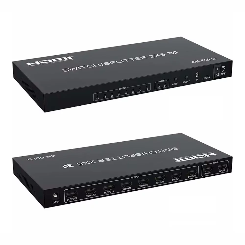 ORIENT HSP0208H-2.0, HDMI переключатель/разветвитель 2-]8, UHD 4K/60Гц (3840x2160), HDR, HDMI 2.0, HDCP 2.2, пульт ДУ, внешний БП 5В/2A, метал.корпус (33321)