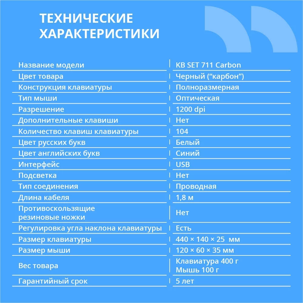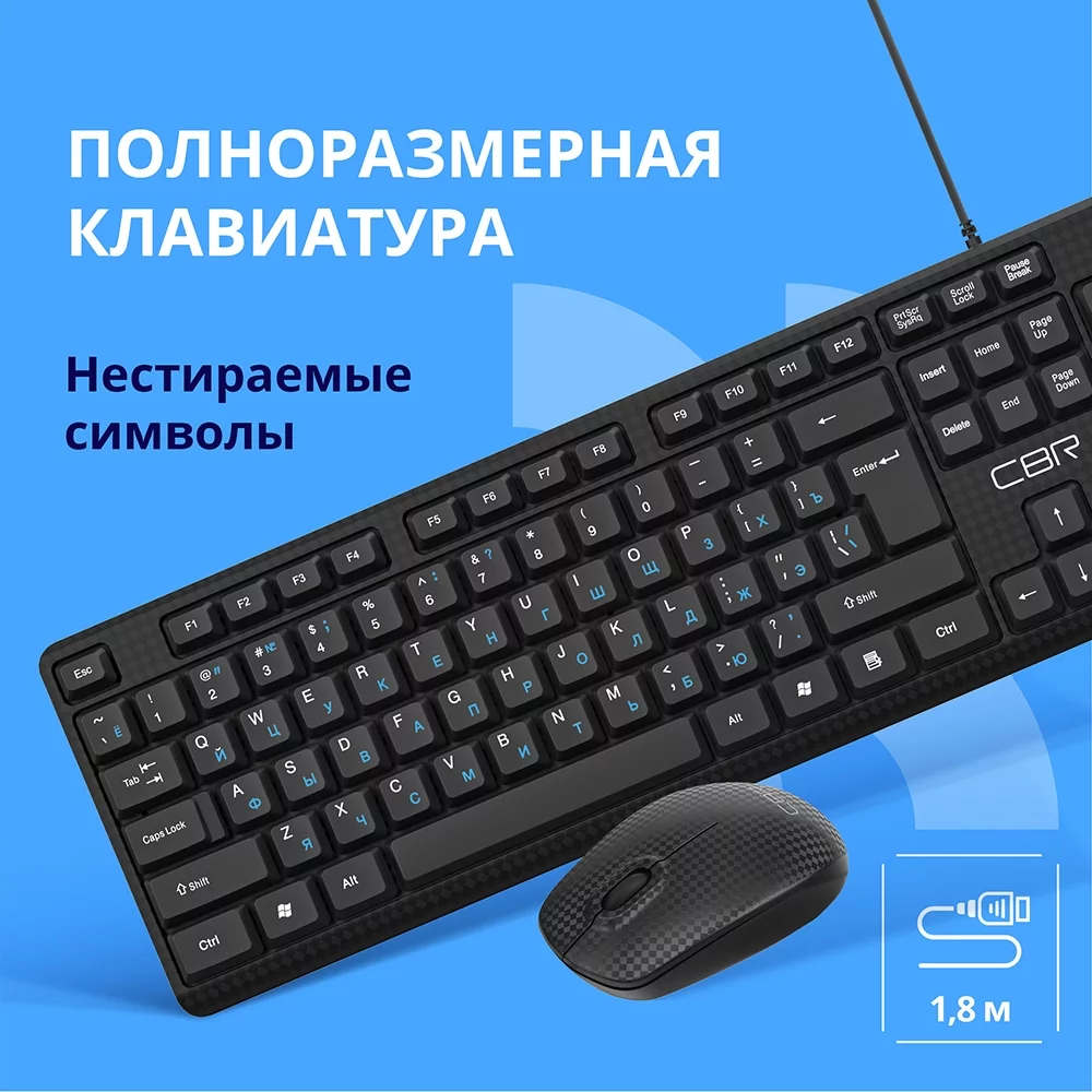 CBR KB SET 711 Carbon, Комплект (кл + м) провод., USB, поверхность "под карбон", кабель 1,8 м; кл.: полноразмерная, 104 кл.; мышь: оптич., 1200 dpi, 3 кн.