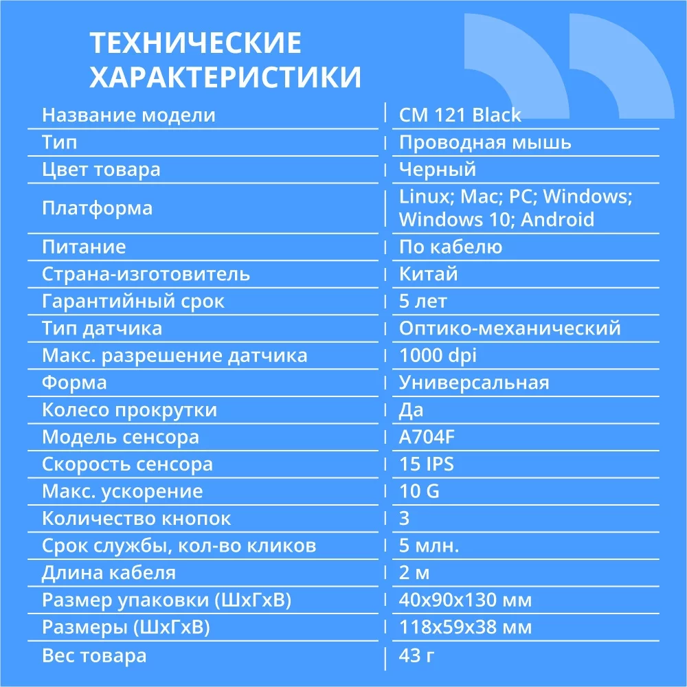CBR CM 121 Black USB, Мышь офисн., оптич., 1000 dpi, 3 кн., 2.0 м