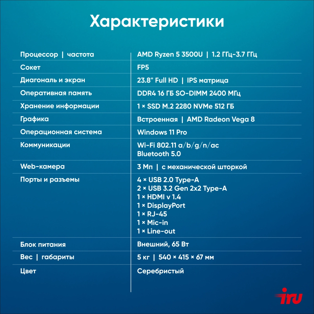 Моноблок IRU Planio 235 23.8" Full HD Ryzen 5 3500U (2.1) 16Gb SSD512Gb Vega 8 Windows 11 Pro 64 GbitEth WiFi BT 120W Cam серебристый 1920x1080 (2105031)