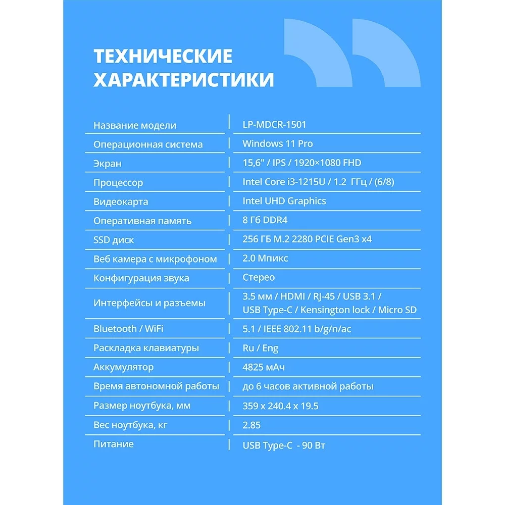 CBR LP-MDCR-1501 15.6" FHD IPS (Intel i3-1215U(1.3GHz) / 8Gb DDR4 3200MHz (2slot) / 256Gb SSD PCIe / Intel UHD Graphics (support Iris Xe with dual RAM) / RJ45 / W11Pro/ 4250 mAh / металл+ пластик) (CBR-HNLP15I3G12-8G256G-WP)