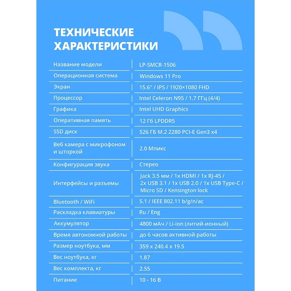 Ноутбук CBR LP-SMCR-1506 15.6" FHD IPS (Intel Celeron N95/ 12Gb LPDDR5/ 256Gb M.2 SSD/ Intel UHD Graphics/ RJ45/ W11 Pro/ 4800mAh/ пластик) (CBR-HNLP15N95-12G256G-WP)