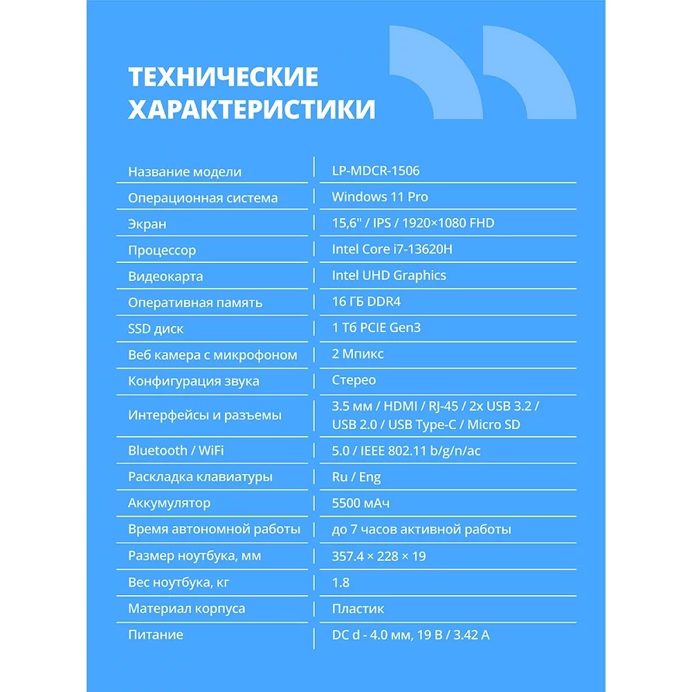 Ноутбук CBR LP-MDCR-1506 15.6" FHD IPS (Intel i7-13620h(1.3GHz)/ 8Gb*2 DDR4 3200MHz/ 1024 Gb SSD PCIe/ Intel UHD Graphics/ RJ45/ W11Pro/ 5500 mAh/ пластик) (CBR LP-MDCR-1506-I7-13620H-16GB-1024GB-W11)