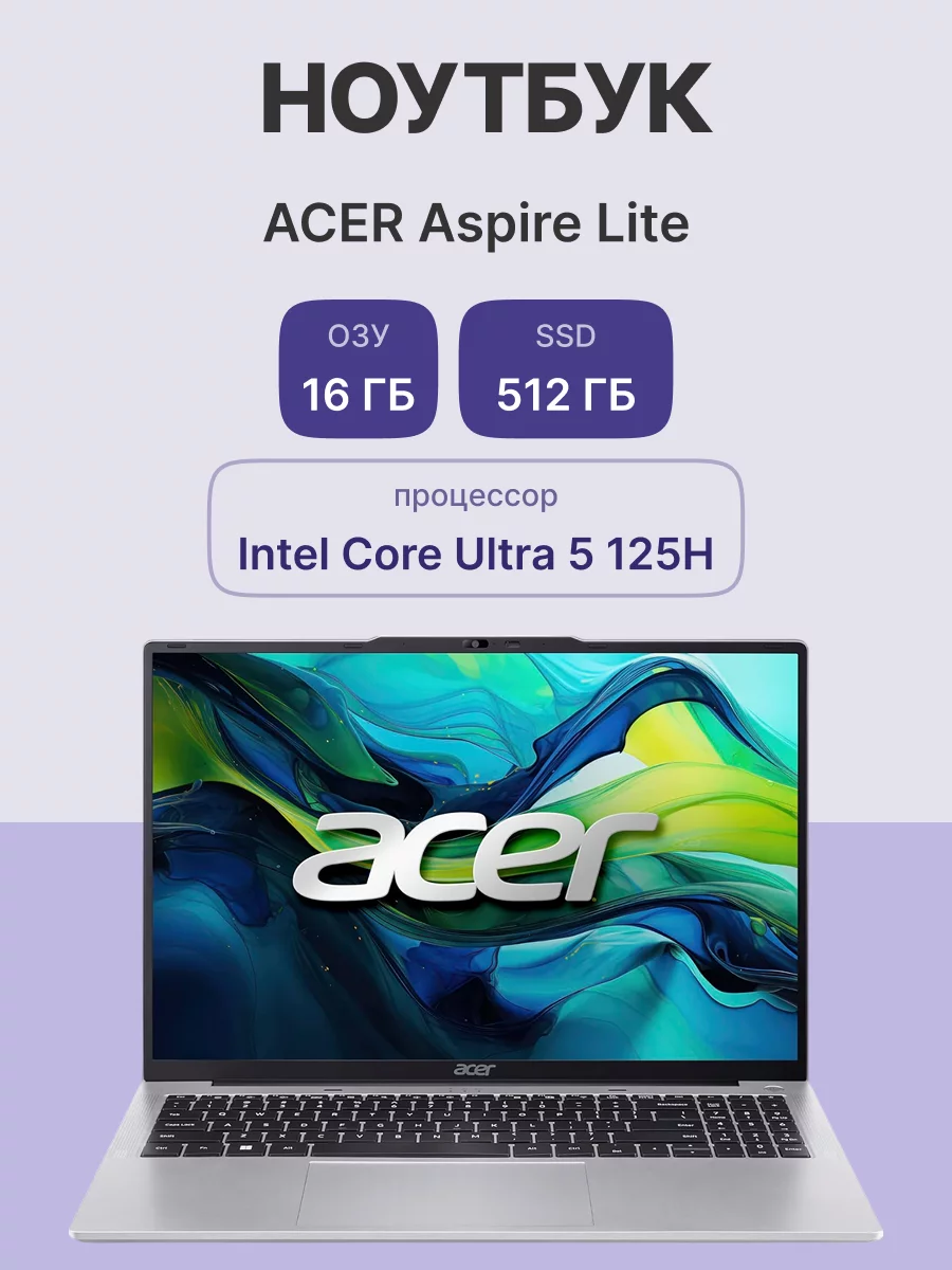 Ноутбук Acer Aspire Lite AL16-71P-5137 Core Ultra 5 125H/ 16Gb/ 512Gb SSD/ 16"/ IPS/ WUXGA/ 1920x1200/ 180Hz/ NoOS/ Silver (NX.D4YCD.004)