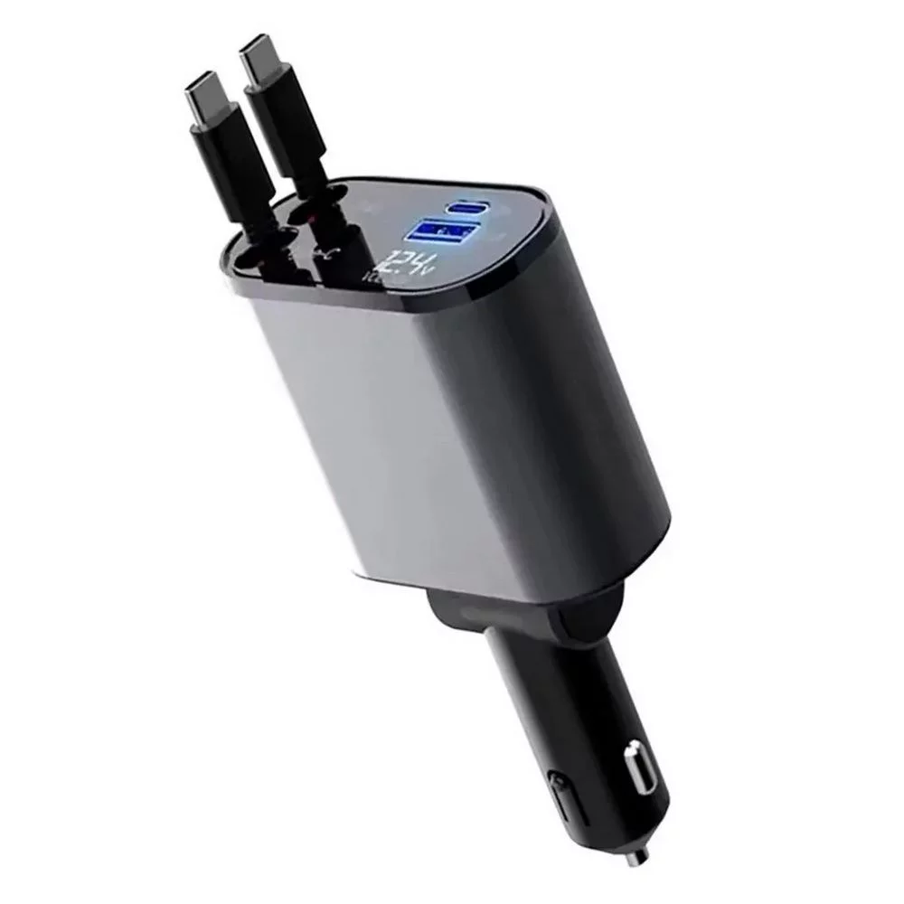 Автомобильная зарядка в прикуриватель SmartiNext 4в1, 2 кабеля Type-C, черный АPC-XH-X11 Встроенные кабели с автоскруткой: Type-C: 2 шт., длина кабелей: 80 см, Дисплей: Да, Порты 2 USB : Type-C, Type-A, Корпус: Алюминиевый, Быстрая зарядка: Да, PD: 20 Вт