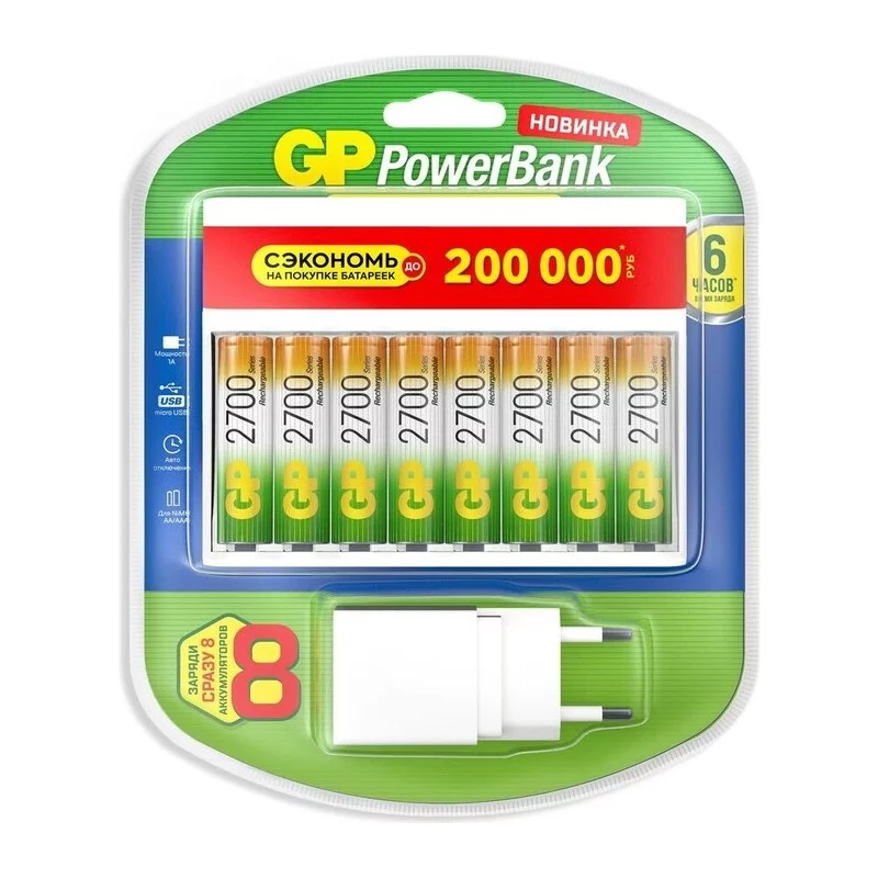 Зарядное устройство для АА и ААА аккумуляторов.В комплекте 8 аккумулятора GP АА2700 + USB адаптер (4610116204108)
