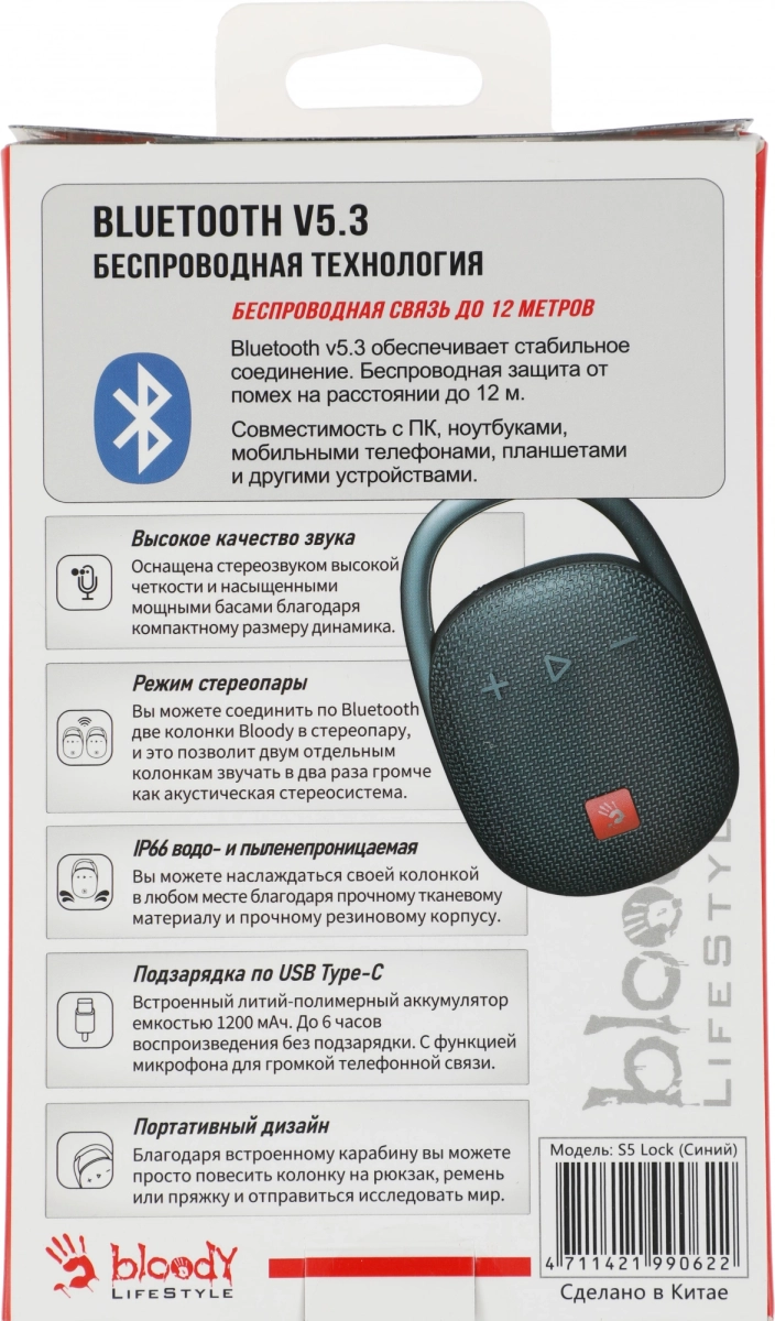 Колонка порт. A4Tech Bloody S5 Lock синий 5W 1.0 BT 10м 1600mAh (S5 LOCK BLUE)