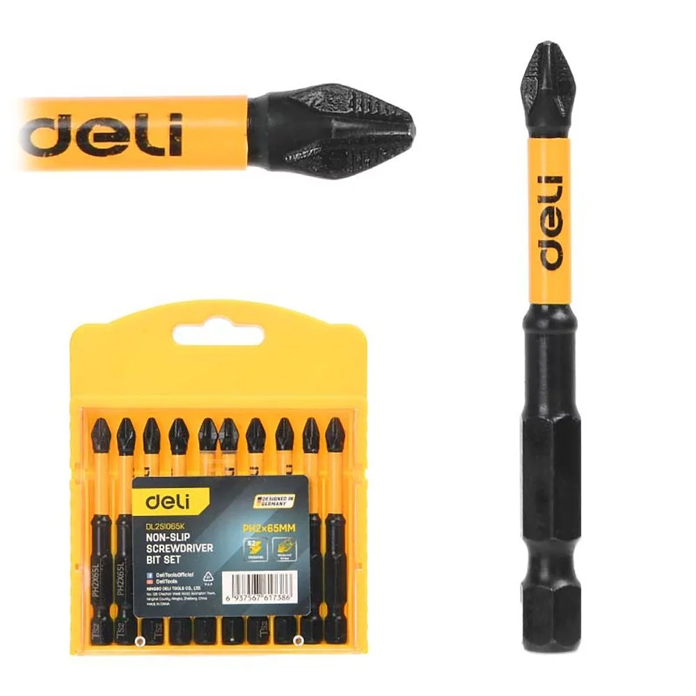 Набор торсионных бит с противоскользящими насечками для ударных шуруповертов 10шт Deli DL251065K PH2*65мм, сталь S2, пласт.кейс