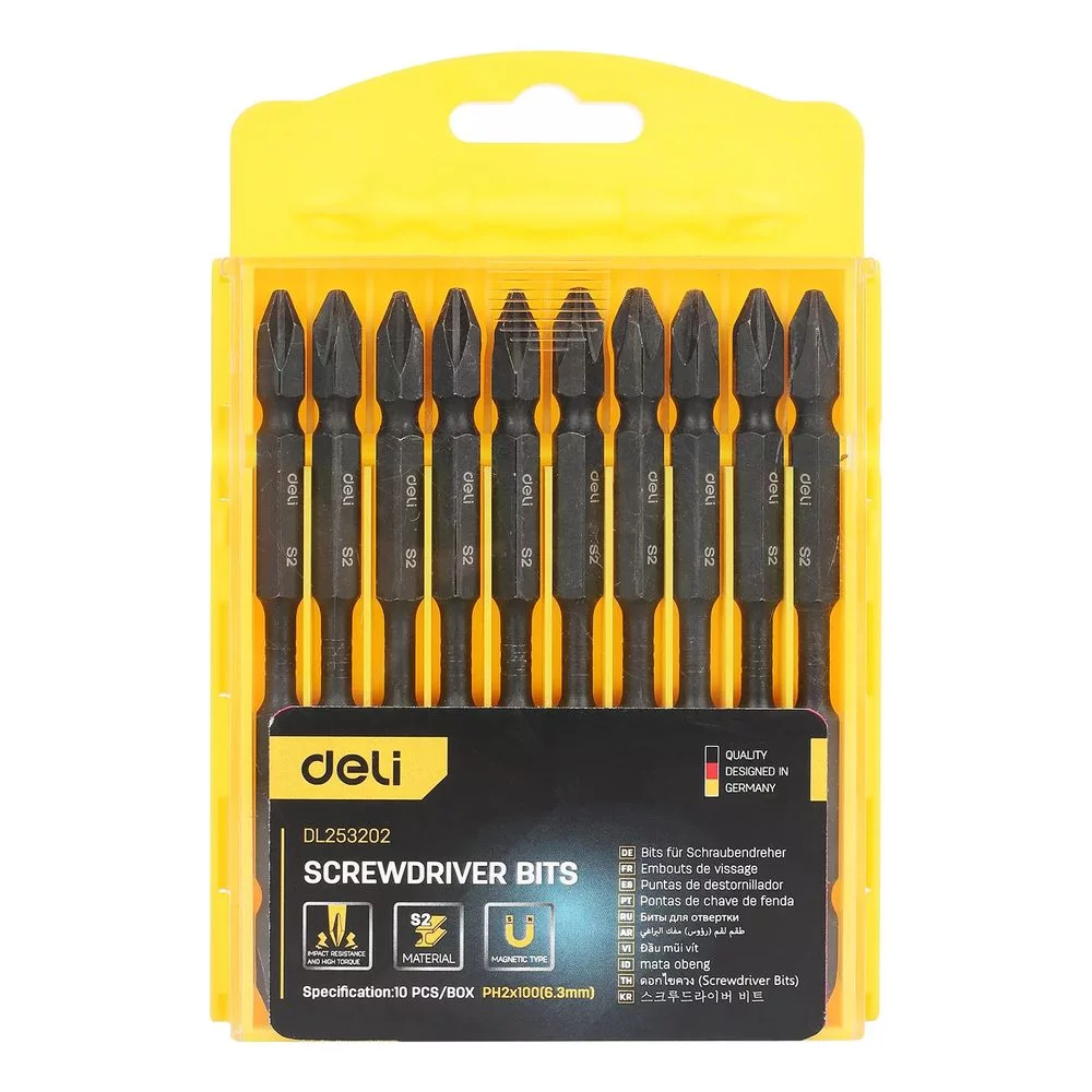 Набор Deli двухсторонних торсионных бит для ударных шуруповертов 10 шт DL253202 PH2*100мм, сталь S2, пласт.кейс