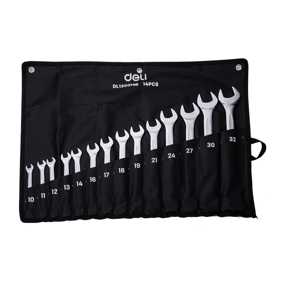 Набор комбинированных гаечных ключей 14 шт Deli DL130014B размеры 10,11,12,13,14,16,17,18,19,21,24,27,30,32мм, матовая хромированная поверхность, чехол из ткани Оксфорд