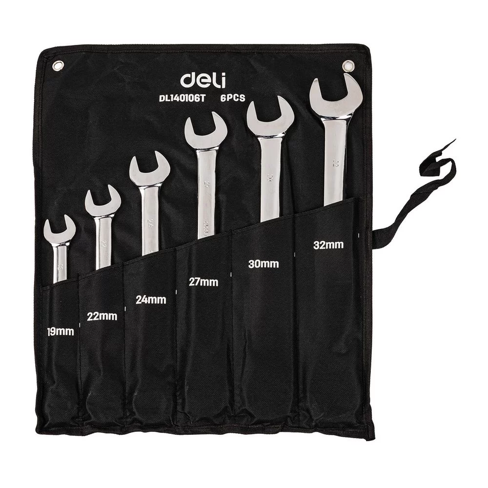 Набор комбинированных ключей с трещоткой 6 шт Deli DL140106T (размеры 19,22,24,27,30,32мм, сталь 40Cr, трещотка 50BV30 72 зуба, чехол из ткани Оксфорд)