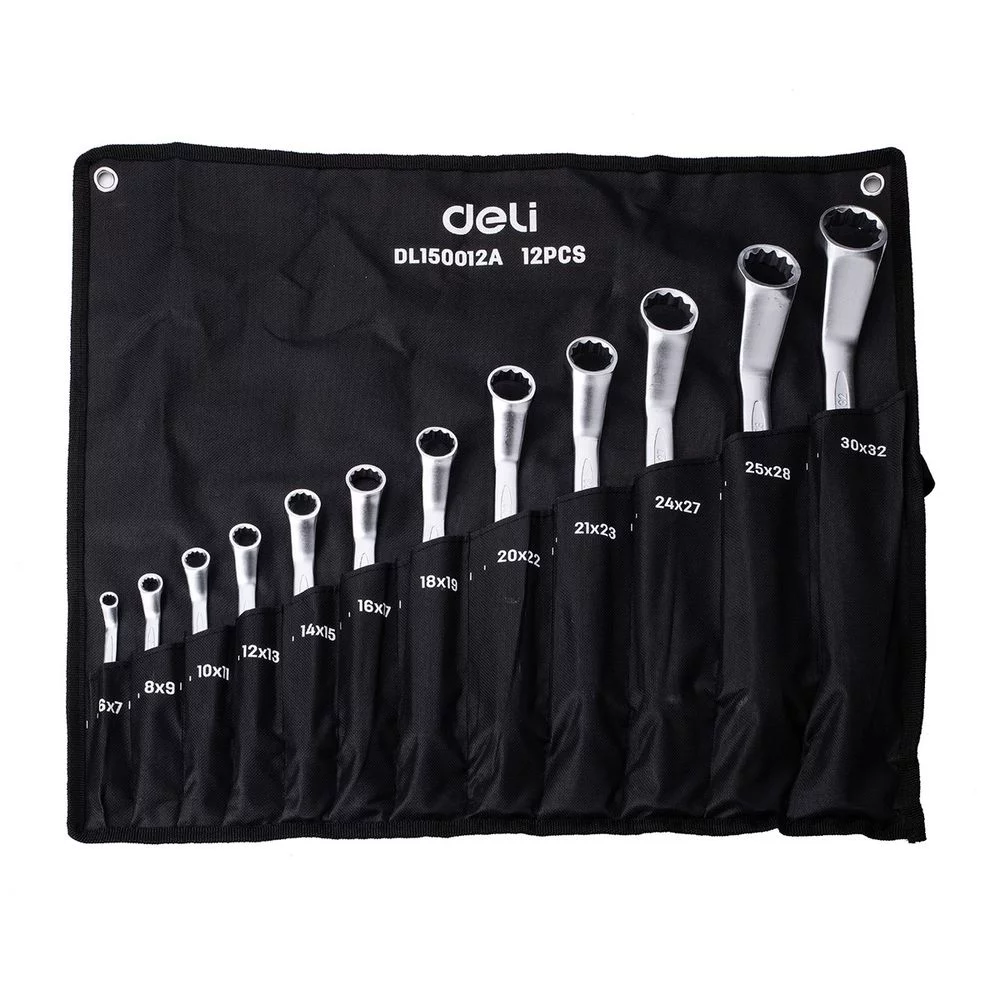 Набор накидных изогнутых гаечных ключей 12 шт Deli DL150012A (размеры 6x7, 8x9, 10x11, 12x13, 14x15, 16x17, 18x19, 20x22, 21х23, 24х27, 25х28, 30х32, матовая хромированная поверхность, чехол из ткани Оксфорд)