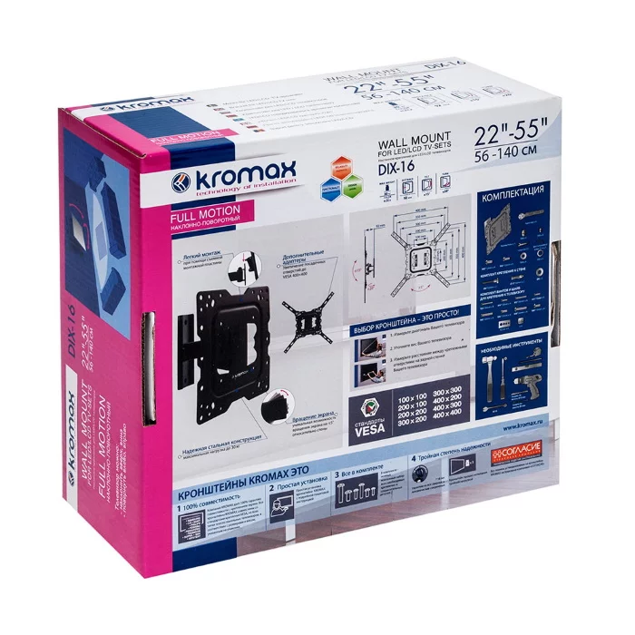 Кронштейн Kromax DIX-16 настенный для LED/LCD TV 22"-55", от стены 56-140 мм, наклон ±15°, поворот ±20°, max 30 кг, черный (20204)