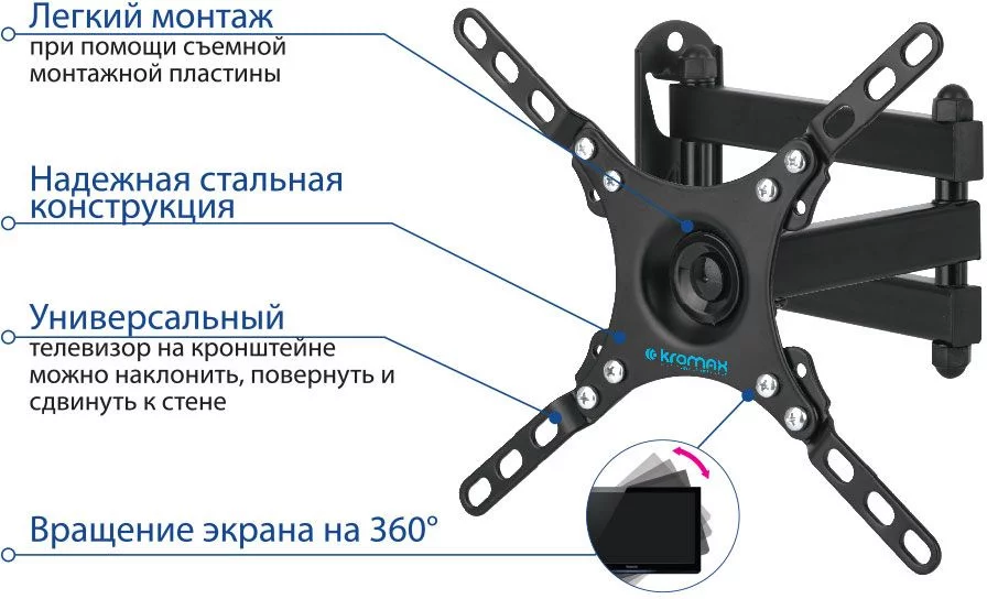 Кронштейн для ТВ KROMAX DIX-13 black (max VESA 200x200 мм., настенный, наклонно-поворотный, max 20 кг) (20262)