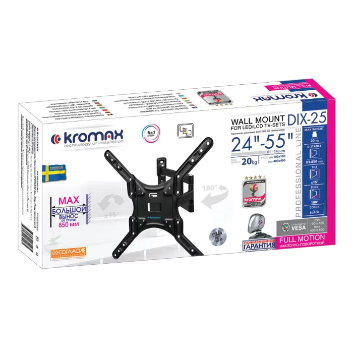 Кронштейн Kromax DIX-25 настенный для LED/LCD TV 24"-55", наклон ±15°, поворот 180°, от стены 81-850 мм, ma 20 кг, черный (24049)