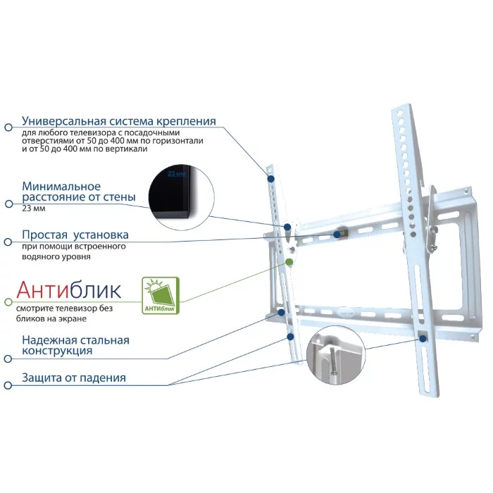 Кронштейн Kromax IDEAL-4 белый для TV 22-65, настенный наклонный, max VESA 400x400, от стены 23 мм, наклон 0-10° (26020)