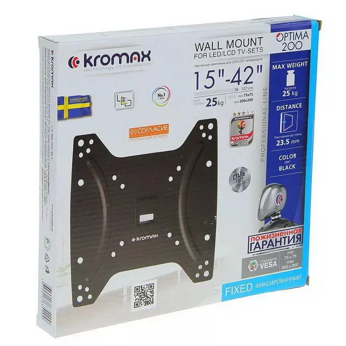 Кронштейн Kromax OPTIMA-200 настенный для LED/LCD TV 15"-42", фиксированный, max VESA 200x200, от стены 23.5 мм, 25 кг, черный (28005)