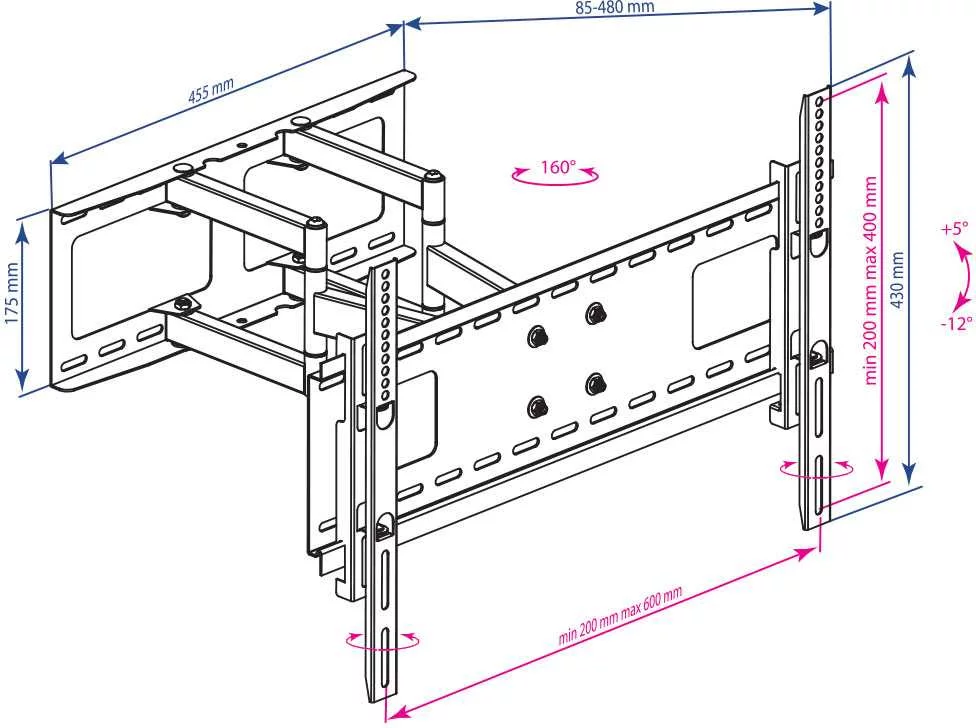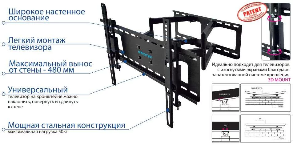 Кронштейн для ТВ KROMAX ATLANTIS-80 black (max VESA 600x400мм, настенный, наклонно-поворотный, 32"-75", max 50 кг) (29003)