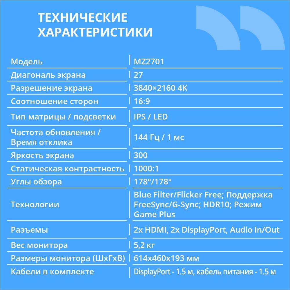 CBR LCD Монитор 27" MZ-2701 безрамочный, IPS, UHD 4K 3840x2160, 144Гц, Динамики 2*3W, HAS, Pivot, 2*DP/2*HDMI, внутренний БП, FreeSync, черный, кабель DP 1.5м в комплекте [LCD-MZ2701-OPC]