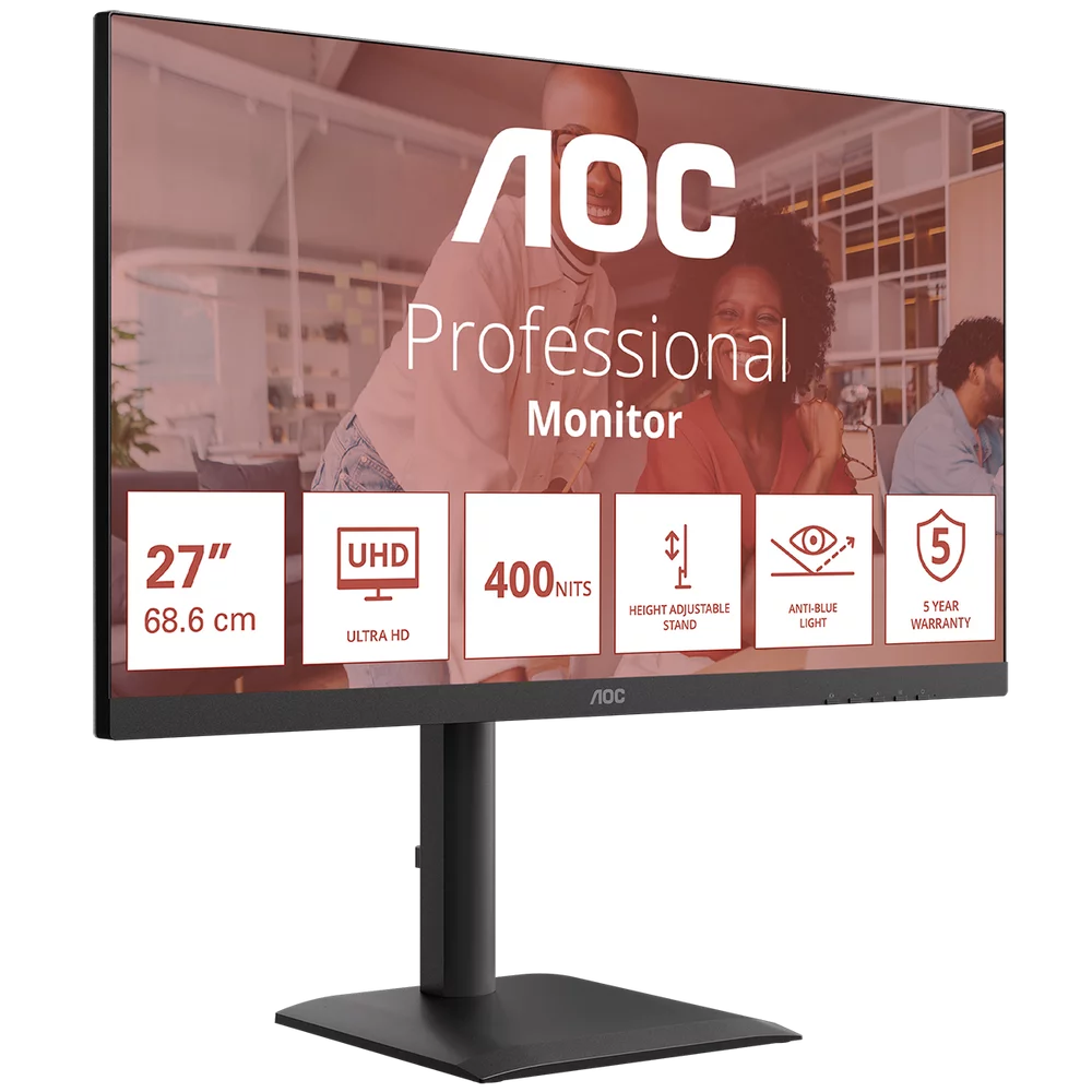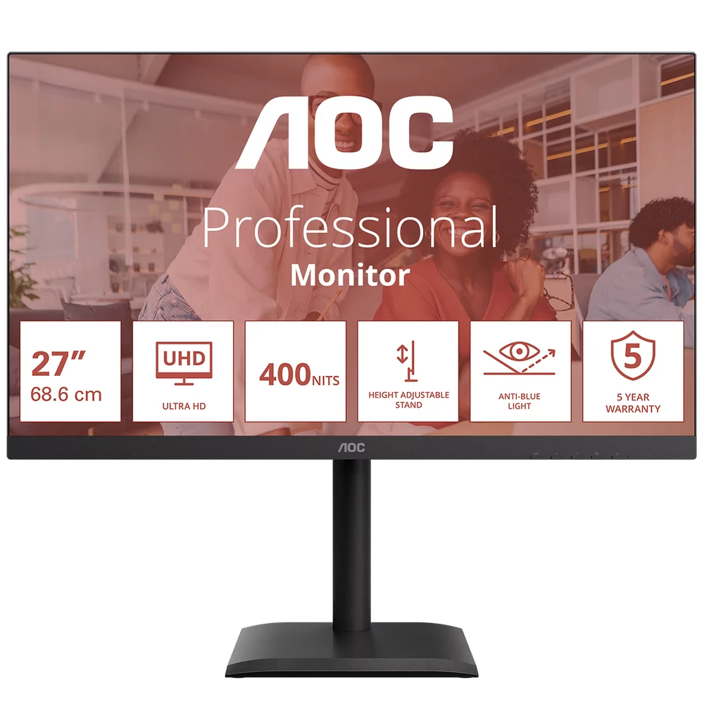 Монитор 27" AOC U27E4CV Black (4K, IPS, 3840x2160, 60Hz, 4 ms, 178°/178°, 400 cd/m, +2xHDMI 2.0, +DisplayPort 1.4, DP Out, USB, USB-C, LAN, SPK, Pivot)