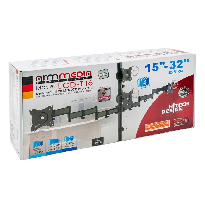 Кронштейн Arm media LCD-T16 настольный для 4-х мониторов LCD 15"-32", наклон ±45°, поворот 360°, вращение 360°, VESA 75 x 75 100 x 100, нагрузка 4x10 кг, черный (10163)