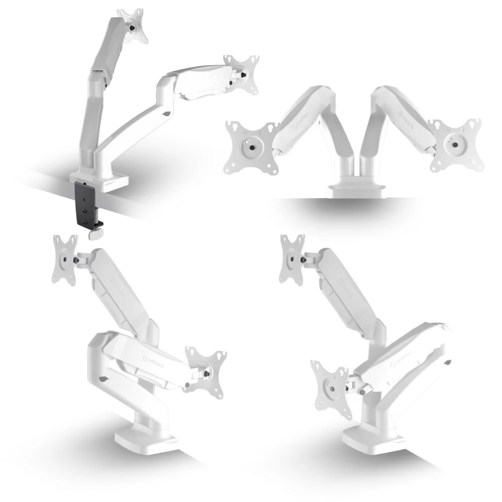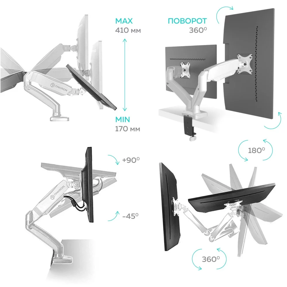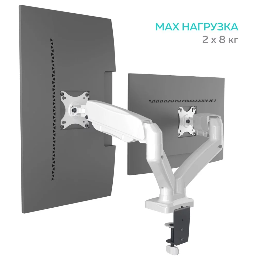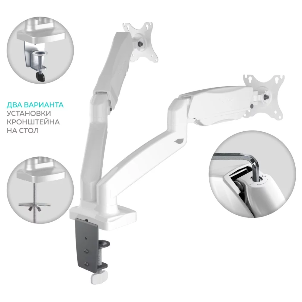 Кронштейн для 2 мониторов ONKRON/ 13-32" ГАЗЛИФТ макс 100*100 наклон -90º/+90º, поворот +-90°, 2 колена, вылет от стены до 450мм, крепление к столу (ONKRON G160 WHITE)