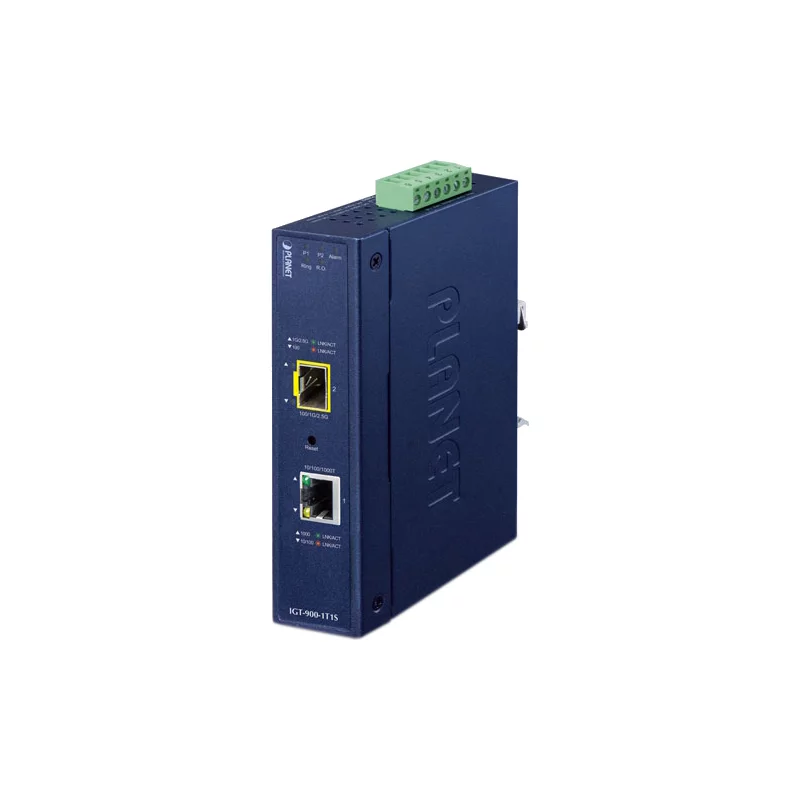 медиа конвертер/ PLANET IGT-900-1T1S IP30 Industrial 1-Port 10/100/1000T + 1-Port 100/1000/2500X SFP Full Managed Media Converter (-40 to 75 C, dual redundant power input on 9~48VDC terminal block, ERPS Ring, 1588, Modbus TCP, Cybersecurity features, IPv4