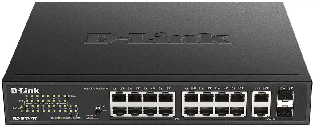 Коммутатор D-Link DES-1018MPV2/A 16x100Мбит/ с 2x1Гбит/ с 16PoE+ 247W неуправляемый