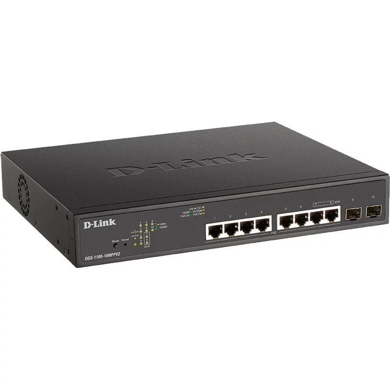 Коммутатор/ EasySmart L2 Switch 8х1000Base-T PoE, 2x1000Base-X SFP, PoE Budget 242W, 2 PoE ports 802.3bt (90W) (DGS-1100-10MPPV2/A3A)