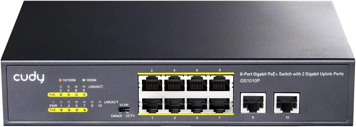Коммутатор/ 8 RJ-45 10/100/1000M PSE ports +2 RJ45 10/100/1000 Uplink Port Unmanaged PoE+ Switch 120W, CCTV/VLAN mode support, long distance:250M at CCTV mode. 802.3af/at standard, Aternative 1/2(+),3/6(-), Rack-mountable Steel Case (GS1010P)