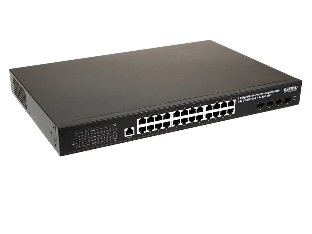 Промышленный PoE коммутатор Gigabit Ethernet OSNOVO SW-24G4X-1L-I Промышленный управляемый L3 PoE коммутатор на 24xGE RJ-45 c PoE + 4х10G SFP+ порта. Порты: 2 x GE (10/100/1000 Base-T) с PoE (до 90W, A+B) + 22 x GE (10/100/1000 Base-T) с поддерж