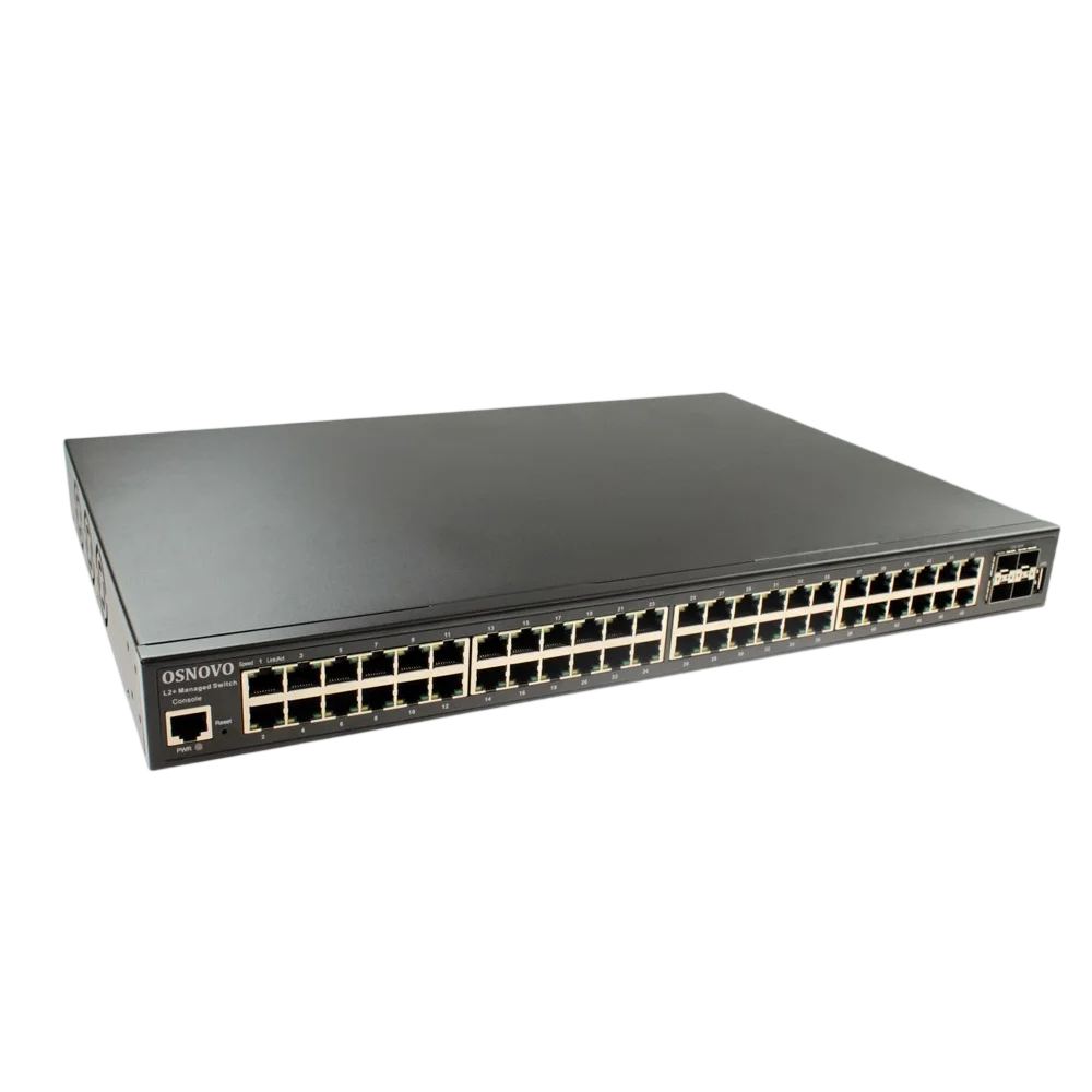 Коммутатор Gigabit Ethernet OSNOVO SW-48G4X-L2 Управляемый L2+ коммутатор Gigabit Ethernet на 52 порта. Порты: 48 x GE (10/100/1000Base-T) + 4 x 1G/10G SFP+ Uplink. Консольный порт, Уровень управления L2+. Поддержка Jumbo Frame