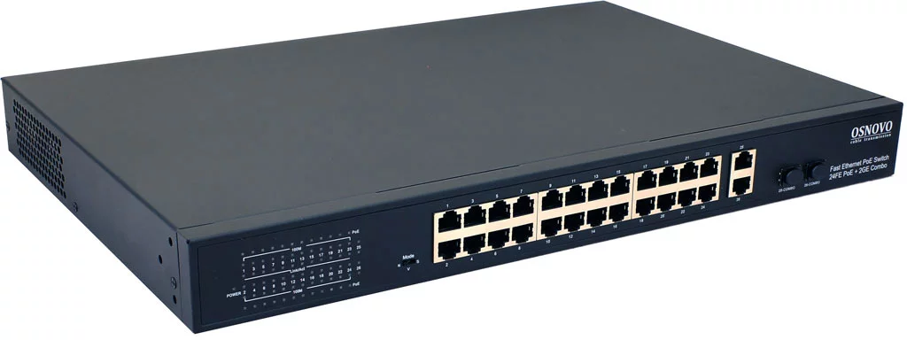 PoE Коммутатор OSNOVO SW-62422(400W) PoE коммутатор Fast Ethernet на 24 x RJ45 портов + 2 x GE Combo uplink порта. Порты: 2 x FE (10/100Base-T) с PoE (до 60W, A+B) + 22 x FE (10/100Base-T) с PoE (до 30W), 2 x GE Com