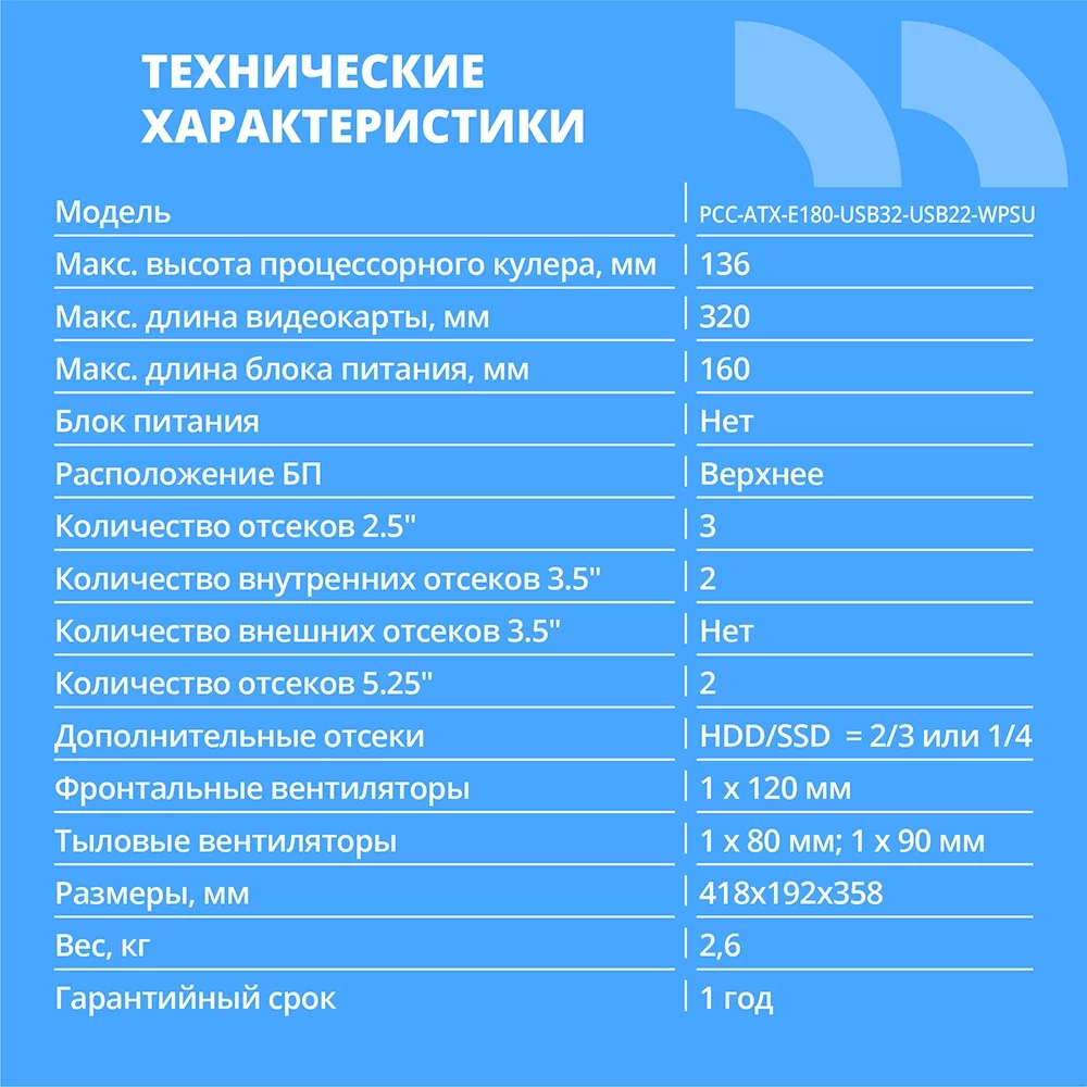 Товар с артикулом PCC-ATX-E180-USB32-USB22-WPSU