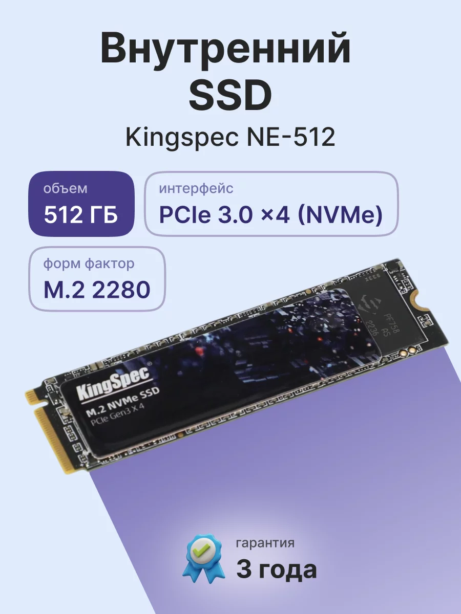 Твердотельный накопитель/ Kingspec SSD NE-512 2280, 512GB, M.2(22x80mm), NVMe, PCIe 3.0 x4, R/W 2400/1700MB/s, IOPs н.д./н.д., TBW 400, DWPD 0.69 (3 года)