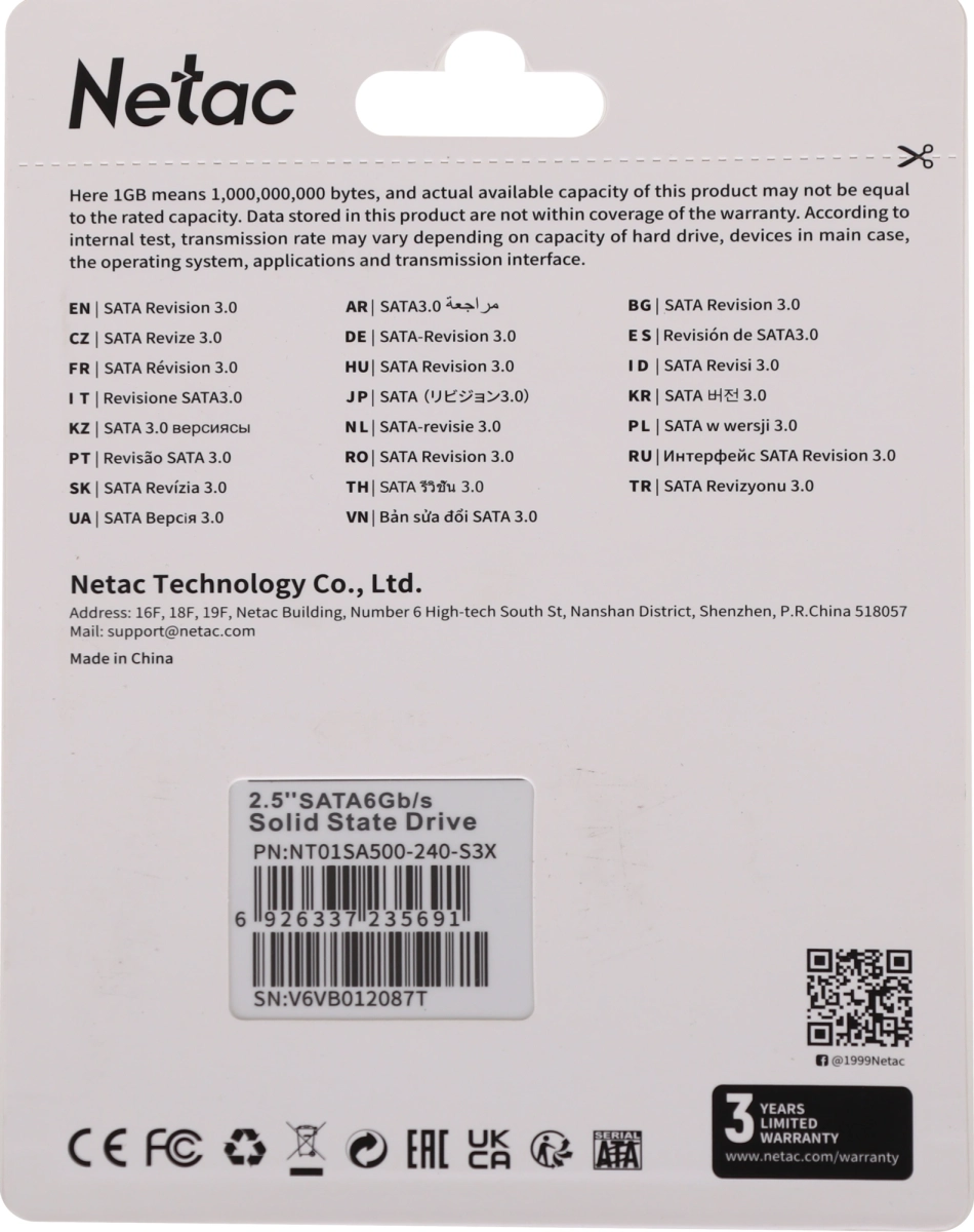 Netac SSD SA500 240GB 2.5 SATAIII 3D NAND, R/ W up to 520/ 450MB/ s, TBW 120TB, 3y wty (NT01SA500-240-S3X)