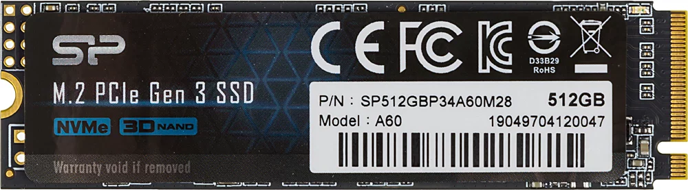 SSD M.2 Silicon Power 512GB A60 <SP512GBP34A60M28> (PCI-E 3.0 х4, up to 2200/1600MBs, 250000 IOPs, 3D TLC, NVMe 1.3, 300TBW, 22х80мм)