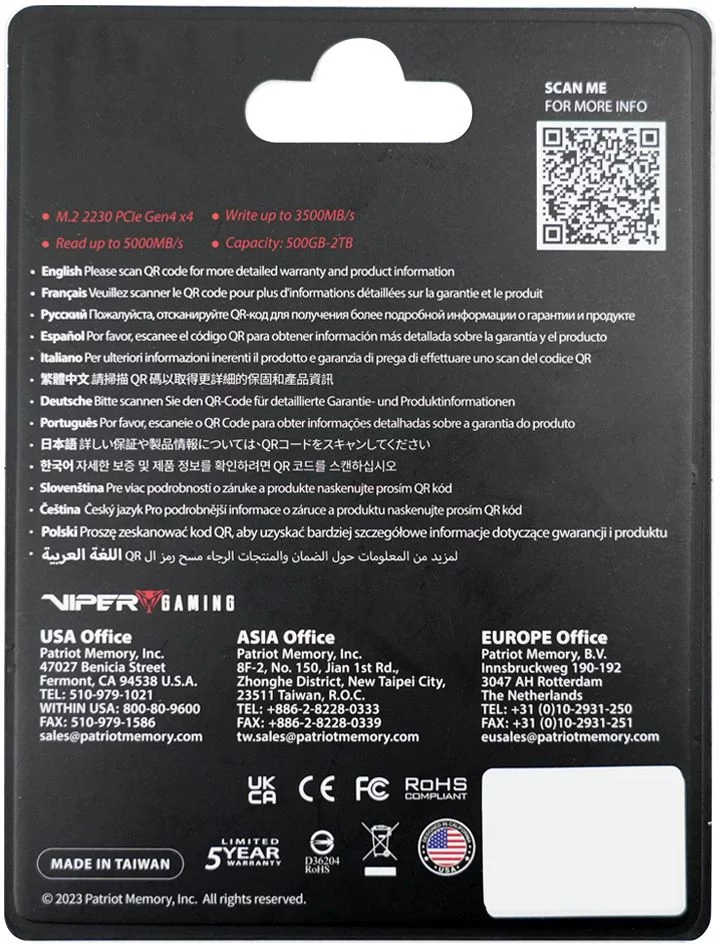 SSD PATRIOT VIPER VP4000 1Тб 3D NAND TLC Скорость записи 3500 Мб/ сек. Скорость чтения 5000 Мб/ сек. M.2 TBW 250 Тб VP4000M1TBM23