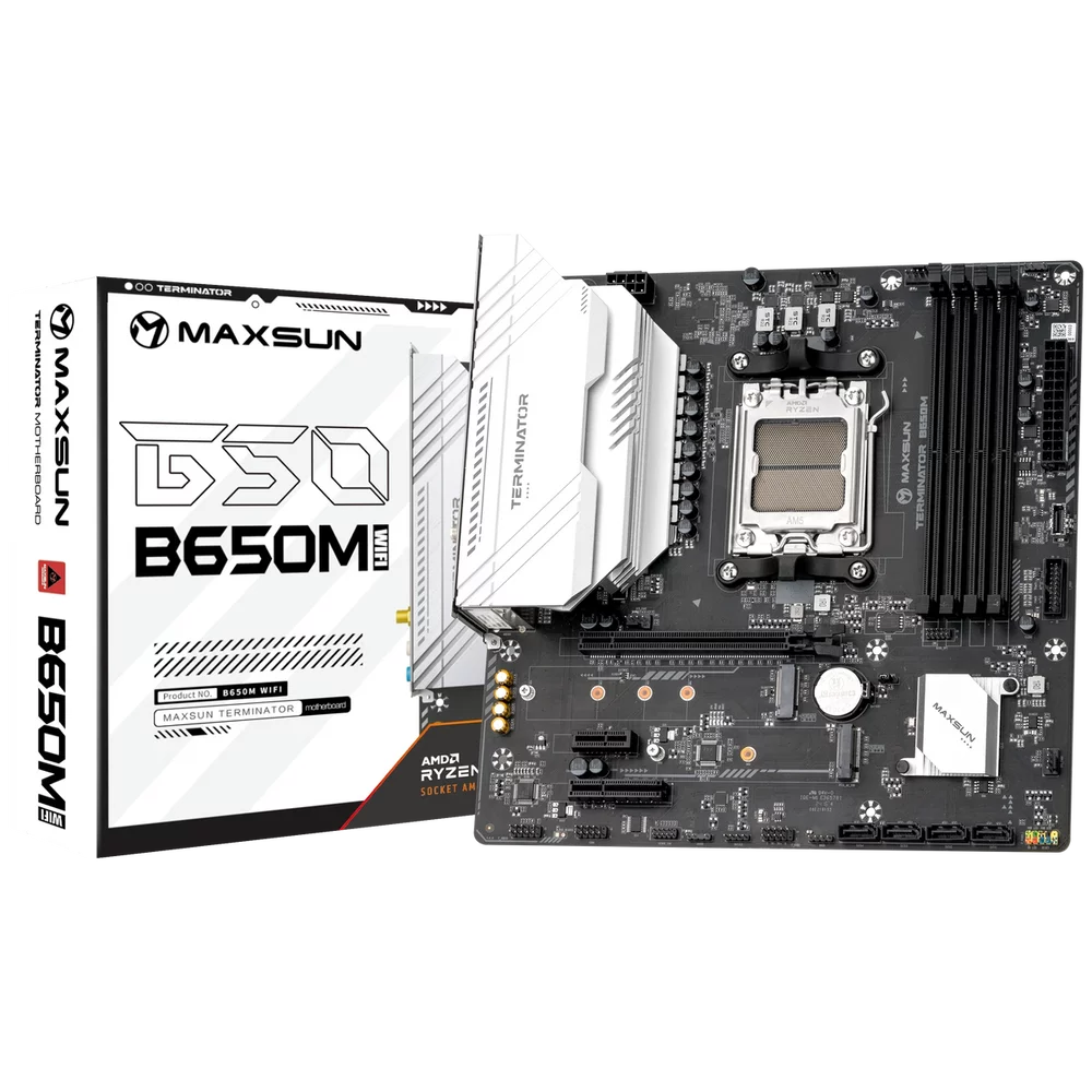 Материнская плата Maxsun MS-Terminator B650M WIFI6 B650, AM5, 4*DDR5, 1*PCIEx16, 1*PCIEx4, 1*PCIEx1, 2*M.2, 2*TypeC, 6*USB3.2Gen1, 6*USB2.0, 4*SATA3.0, 2.5G, DP, HDMI, M-ATX, RTL (6940709660805)