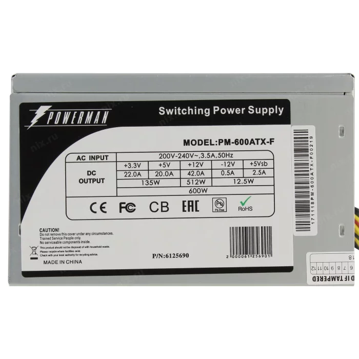 Блок питания Powerman PM-600ATX-F, 600W, ATX 12V v2.2 / PS2, 24+8 pin, 24+4 pin, 20+4 pin, 2xMolex, FDD, 5xSATA, 12cm (6125690)