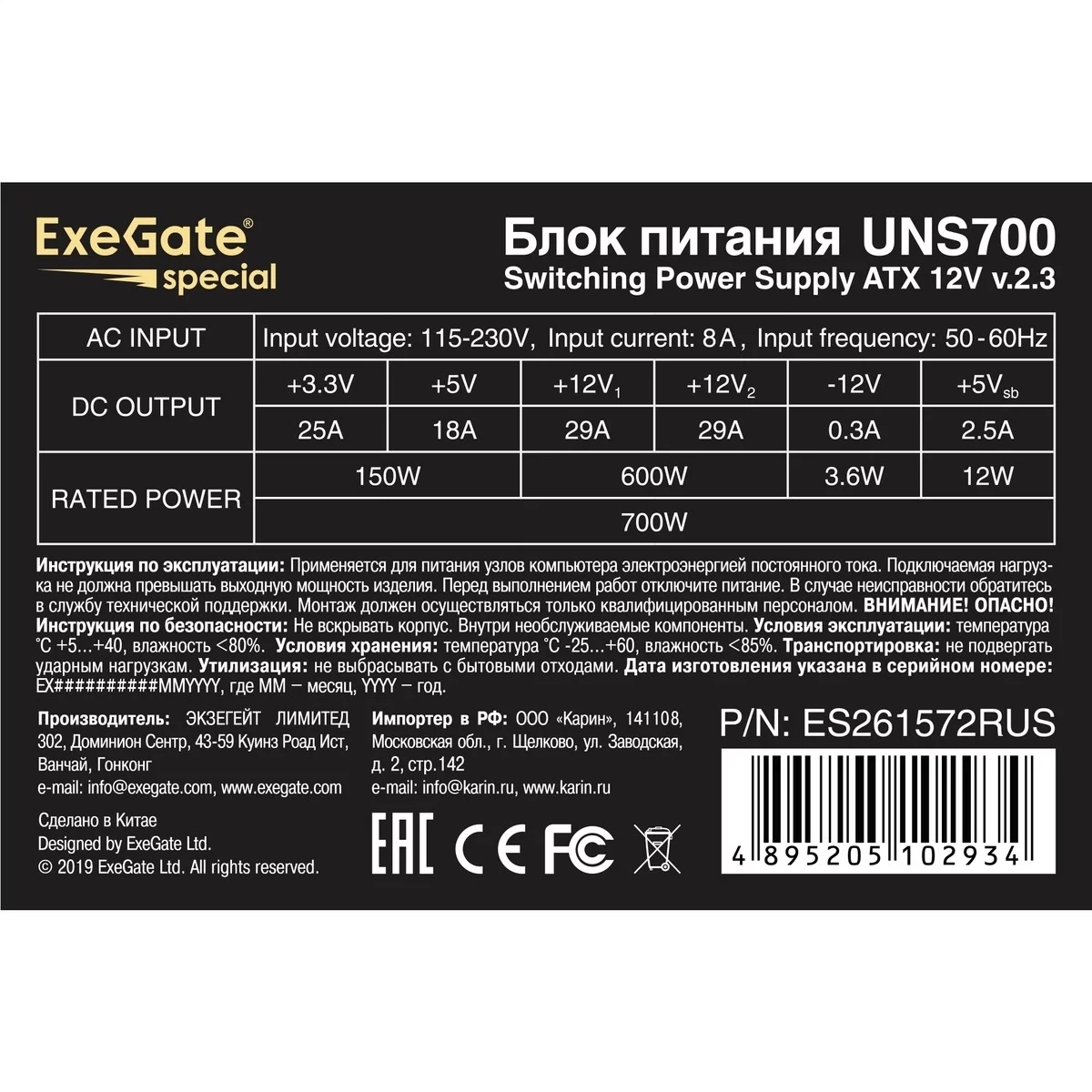 Exegate ES261572RUS Блок питания 700W Exegate Special UNS700, ATX, 12cm fan, 24p+4p, 8/ 6p PCI-E, 3*SATA, 2*IDE, FDD