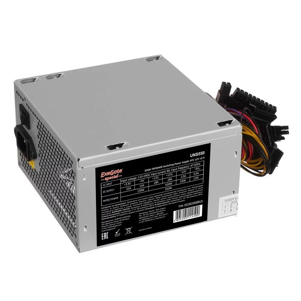 Exegate ES282068RUS Блок питания 550W ExeGate Special UNS550, ATX, 12cm fan, 24p+4p, 6/ 8p PCI-E, 3*SATA, 2*IDE, FDD