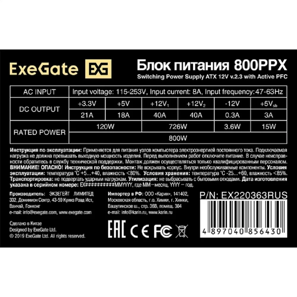 Exegate EX220363RUS Блок питания 800W ATX-800PPX RTL, black, active PFC, 13.5cm, 20+4p/ 4+4p/ PCI-E/ 4*IDE/ 5*SATA