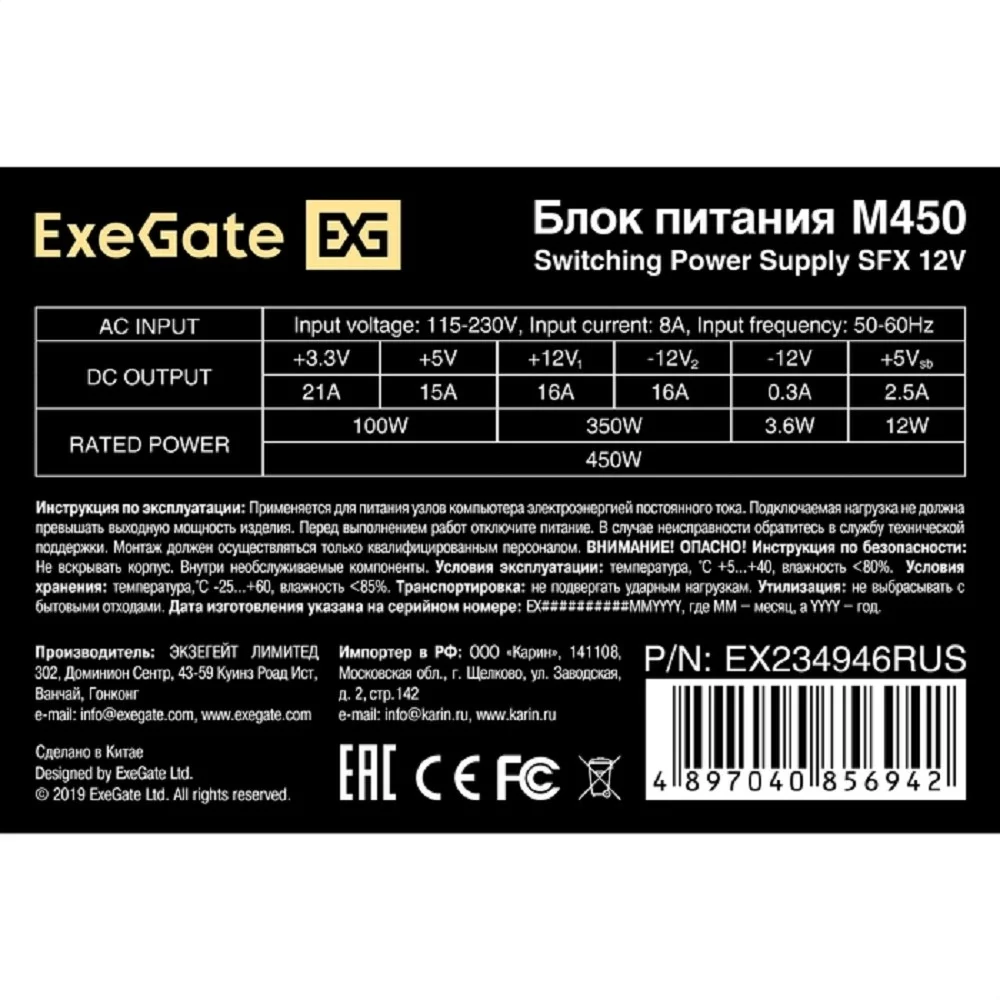 Exegate EX234946/ 251768 RUS Блок питания 450W ITX-M450, SFX, 8cm fan, 24+4pin, 2*SATA, 1*FDD, 1*IDE (EX234946RUS)