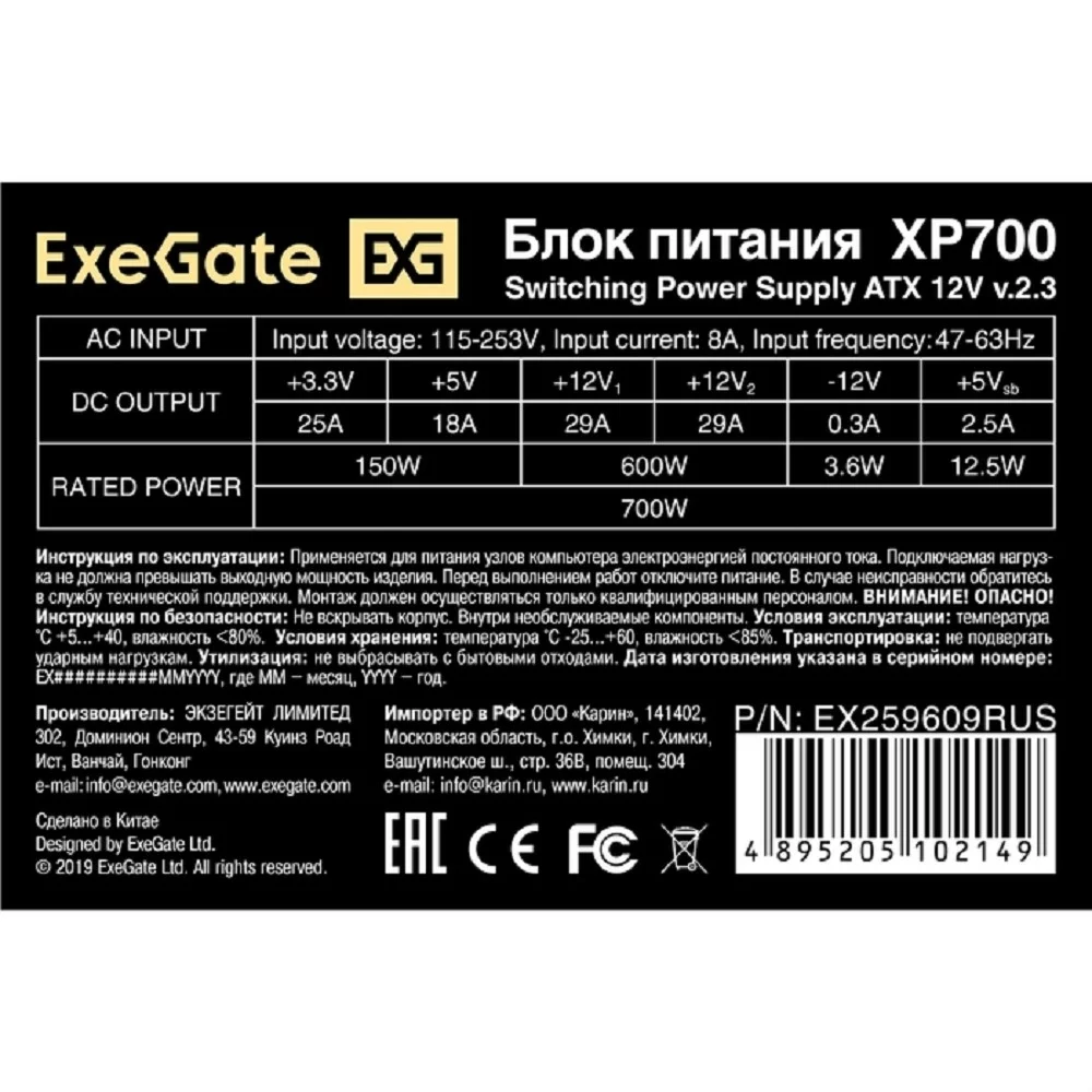 Exegate EX259609RUS Блок питания 700W Exegate XP700, ATX, black, 12cm fan, 24p+(4+4)p, 6/ 8p PCI-E, 4*SATA, 2*IDE, FDD